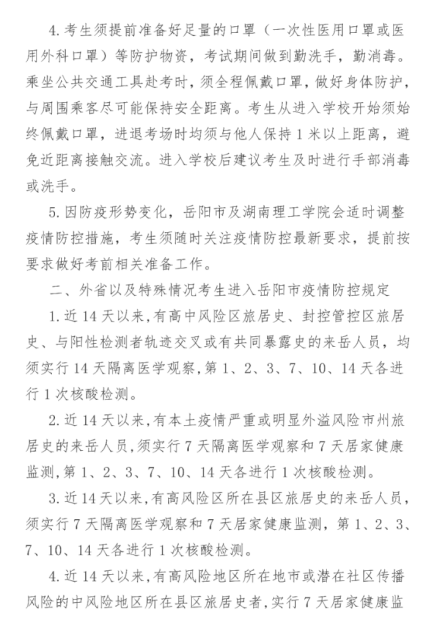 身处岳阳市以外的专升本考生入岳时请提供48小时内核酸检测证明,到达岳阳市后请在岳阳自行再次做核酸检测。除湖南省内本土无疫情发生的市州来岳人员外,其他省内本土有疫情发生的市州及外省来岳人员请微信关注“湖南省居民健康卡”公众号,选择“健康卡”,在便民服务中选择“入湘报备”,填写相应信息进行报备。如有其他疫情防控方面的疑问,请拨打岳阳市疫情防控办电话07302955131咨询,其他专升本相关问题请拨07308648845.